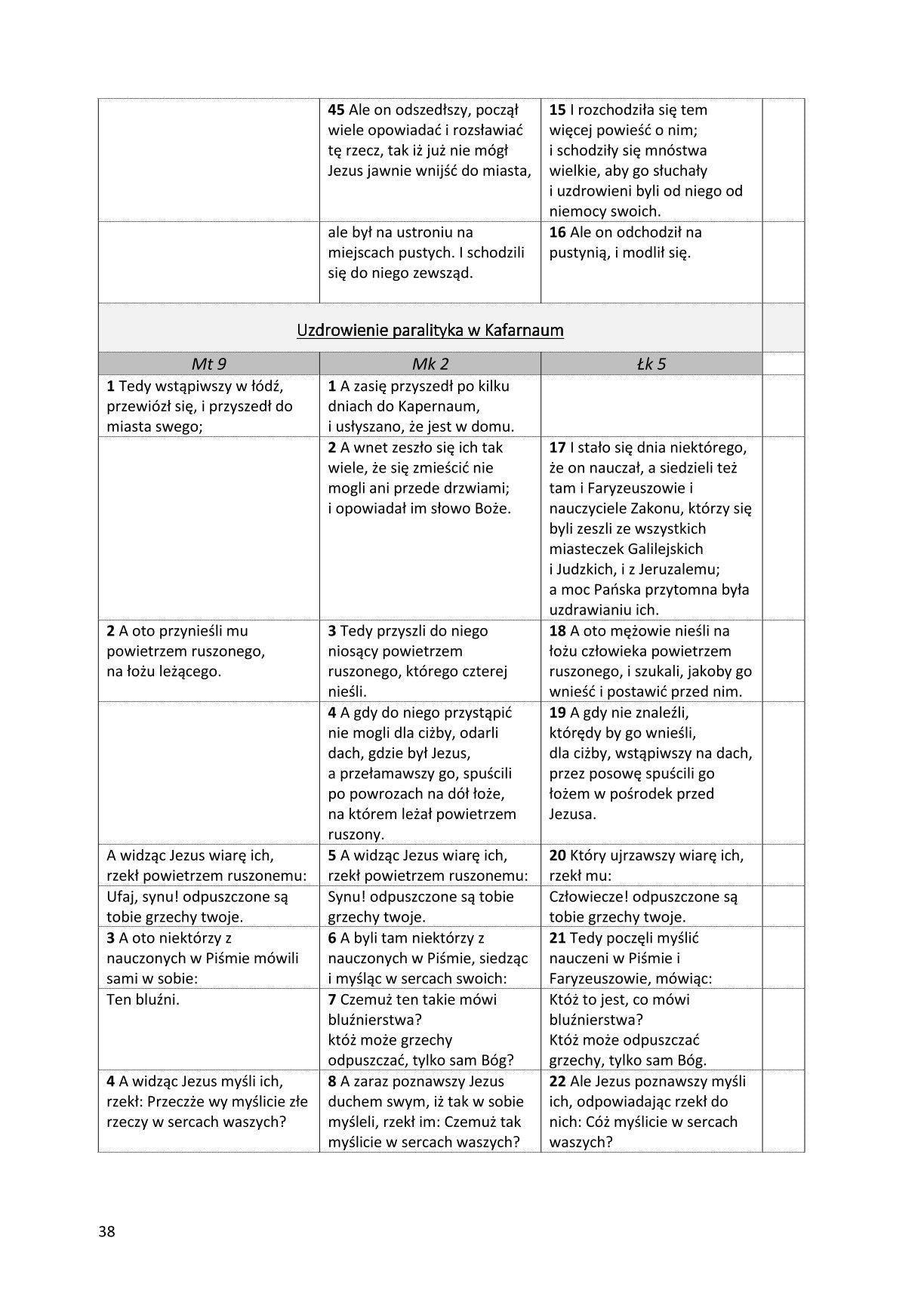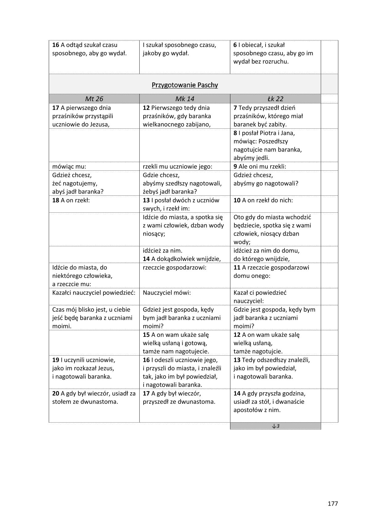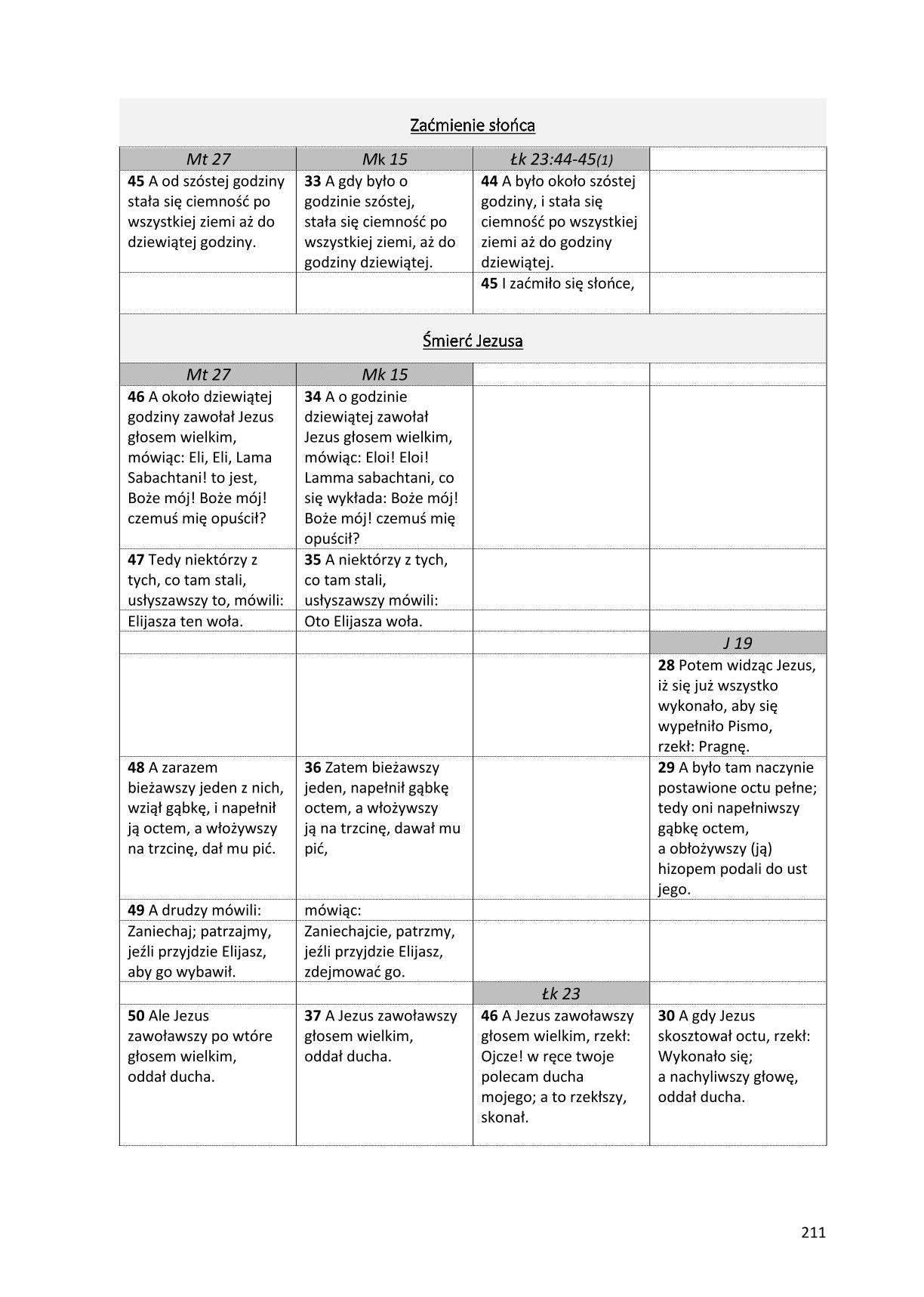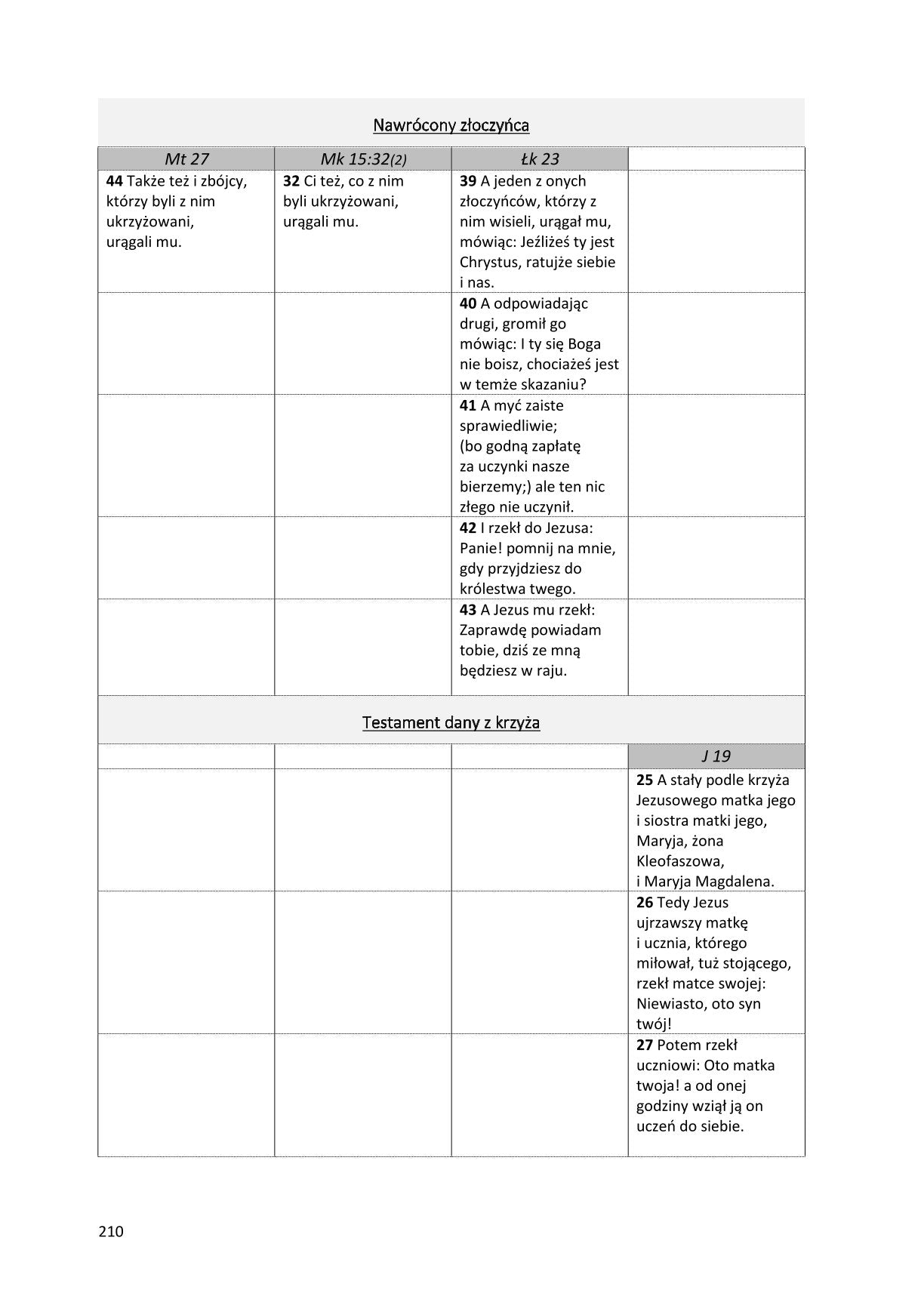 Wszystkie cztery Ewangelie są przejrzyście uporządkowane w formie tabeli, co pozwala na zachowanie przeglądu i skuteczne wyszukiwanie informacji.