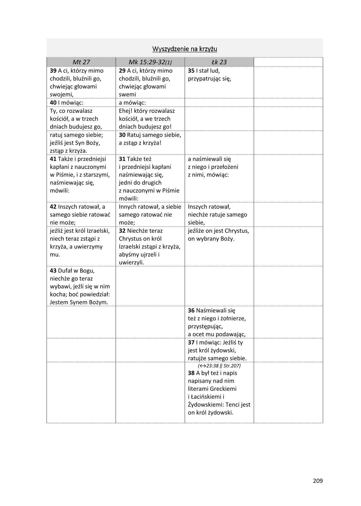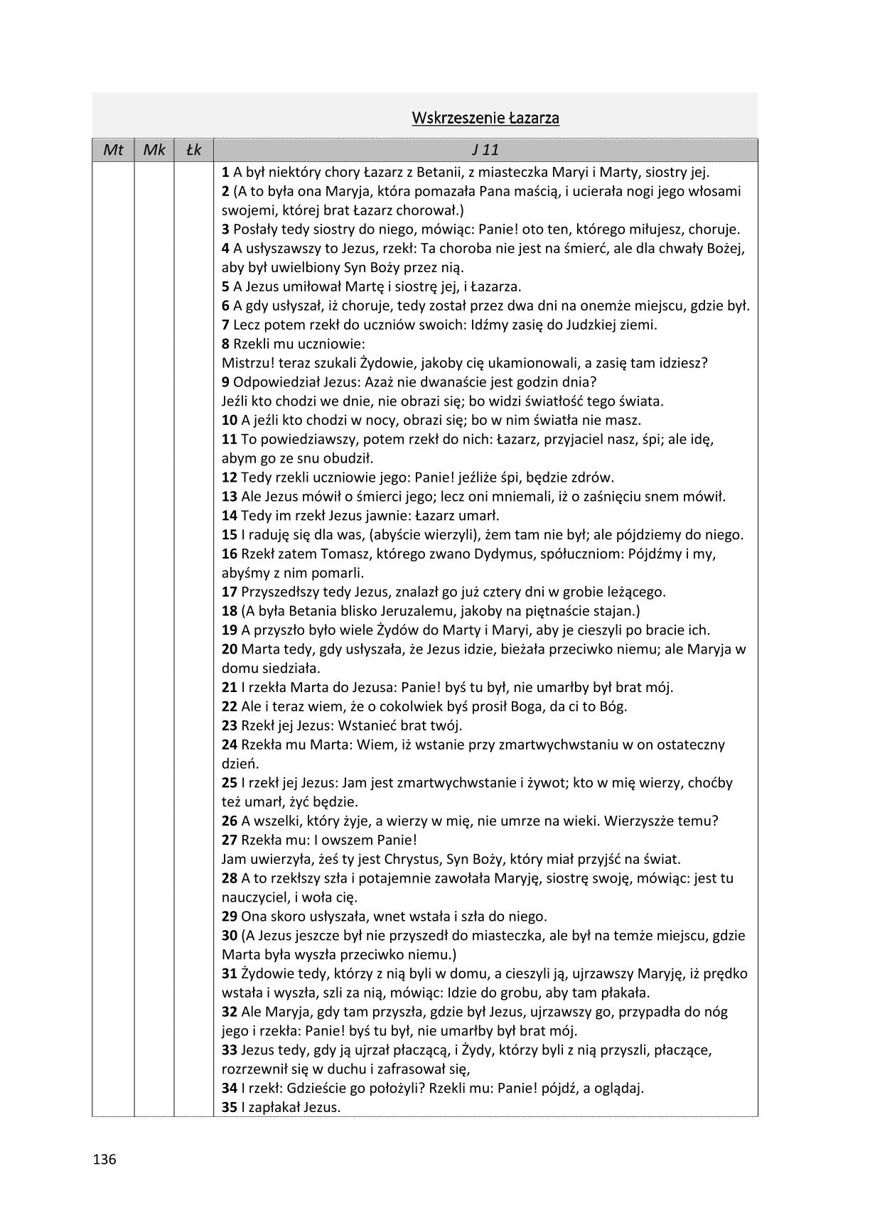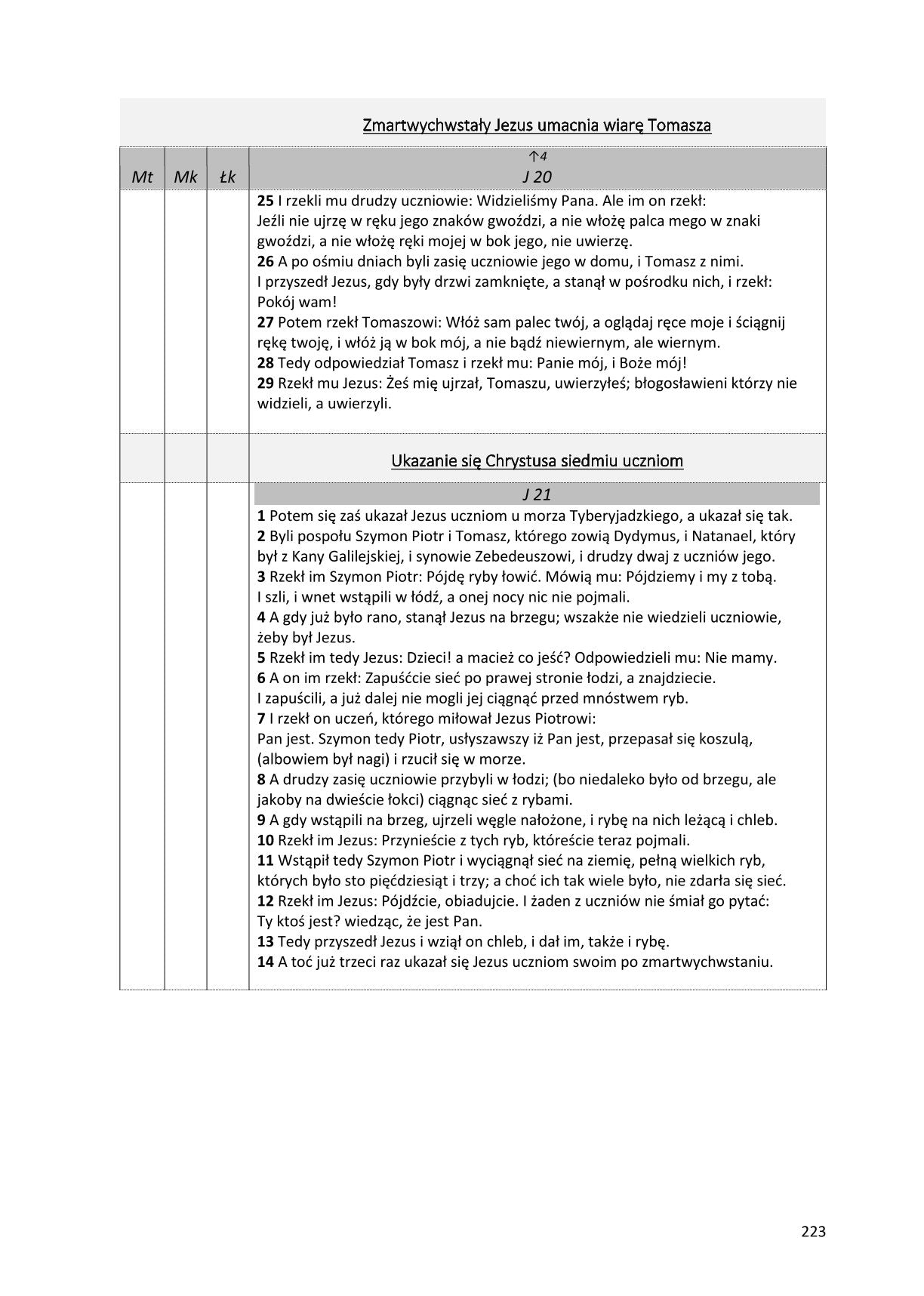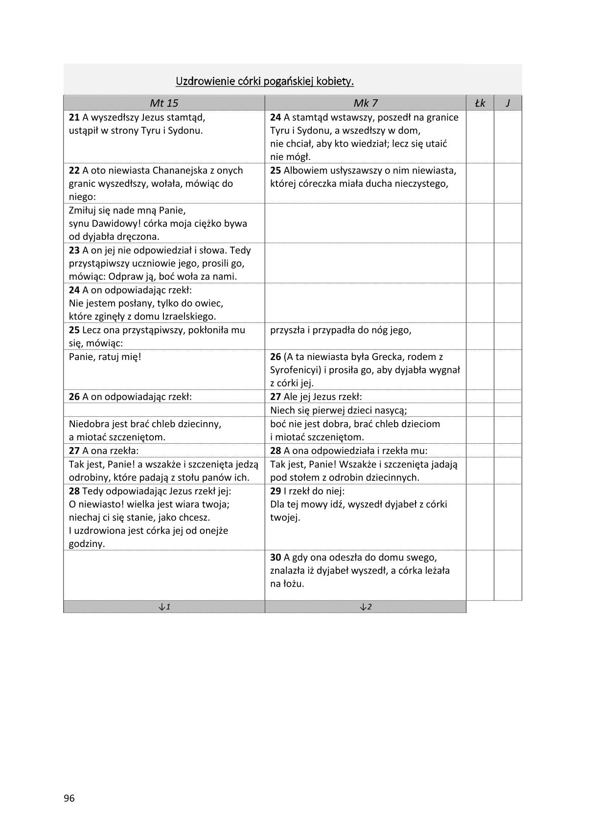 Wszystkie cztery Ewangelie są przejrzyście uporządkowane w formie tabeli, co pozwala na zachowanie przeglądu i skuteczne wyszukiwanie informacji.