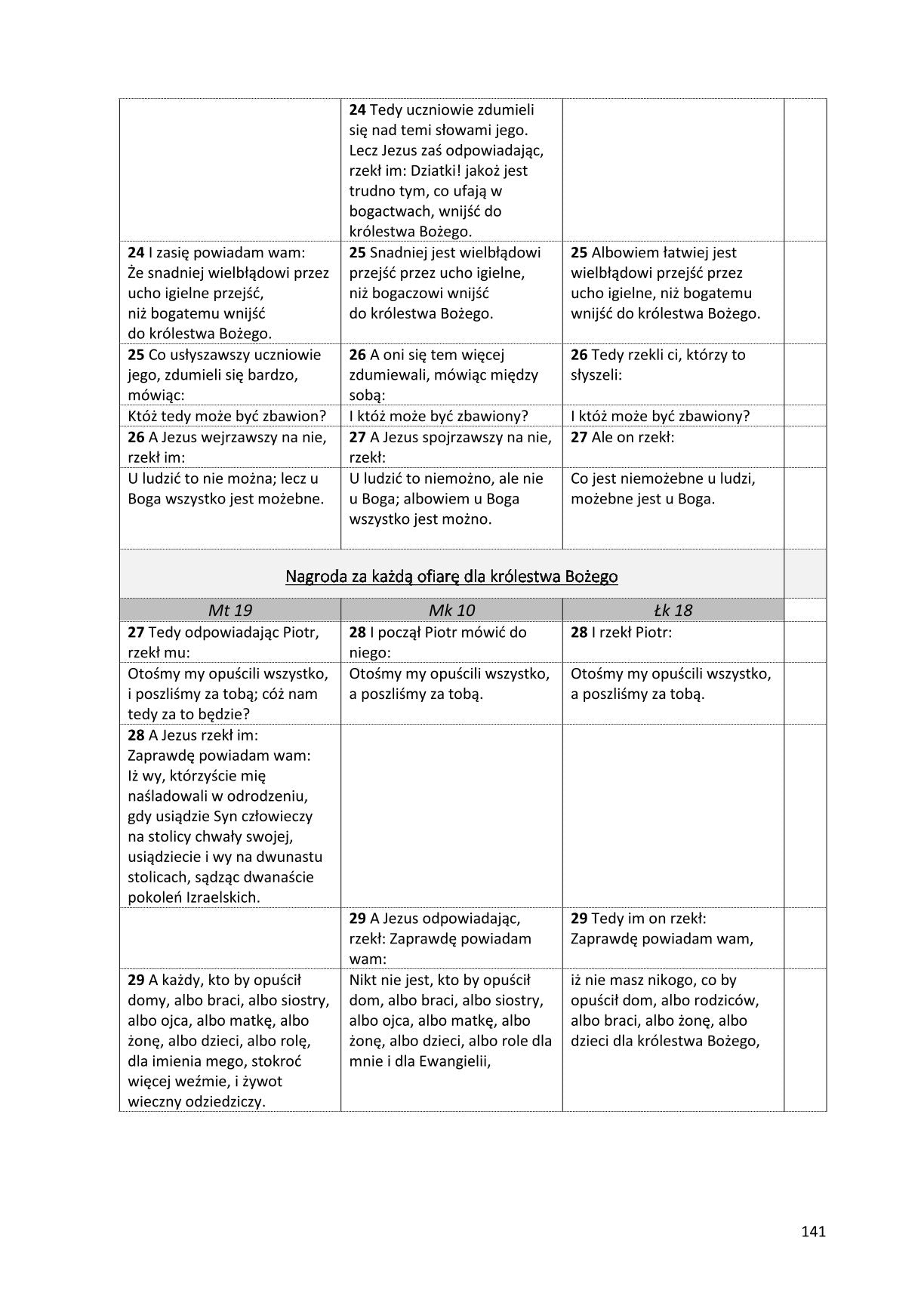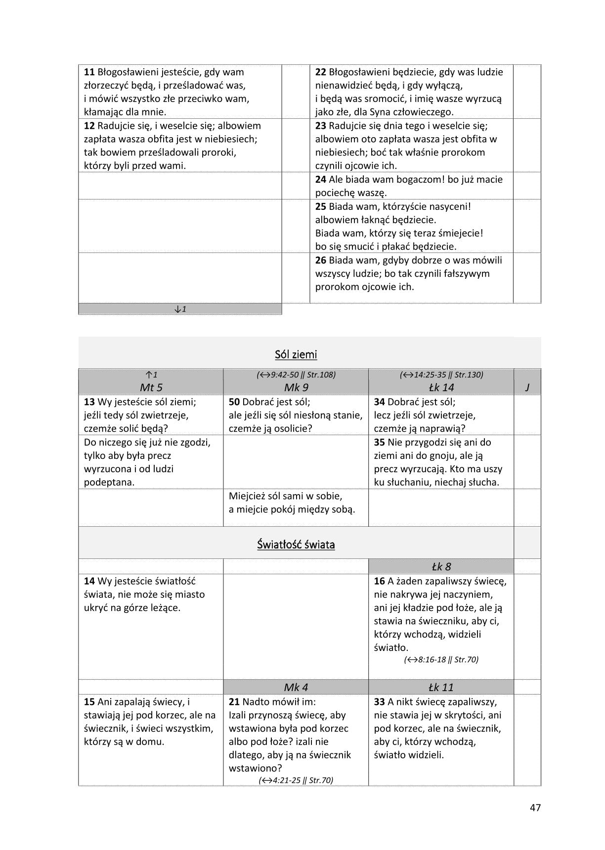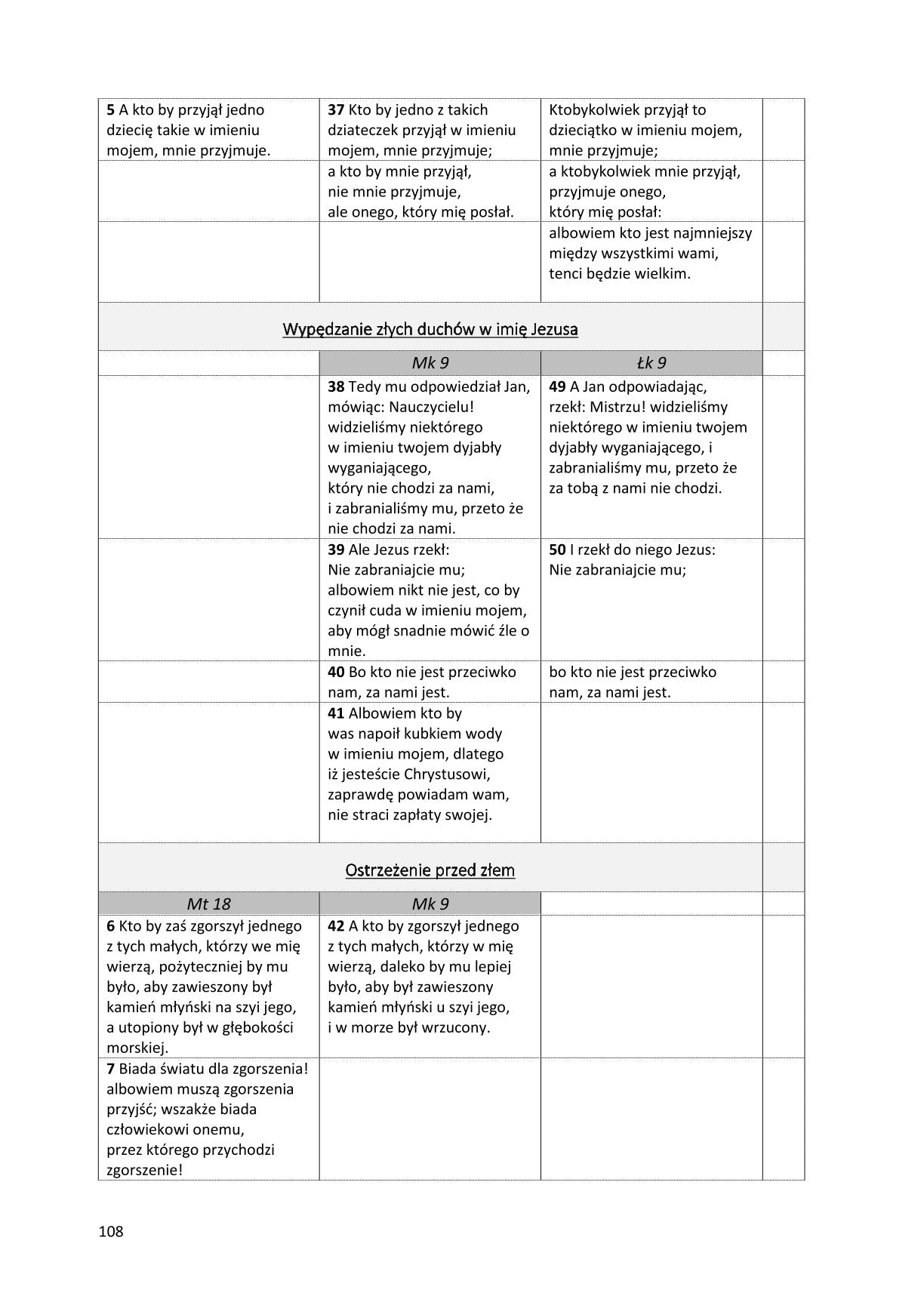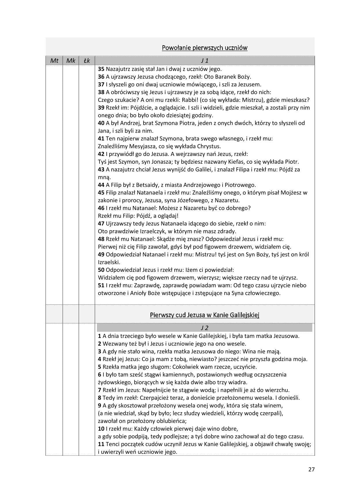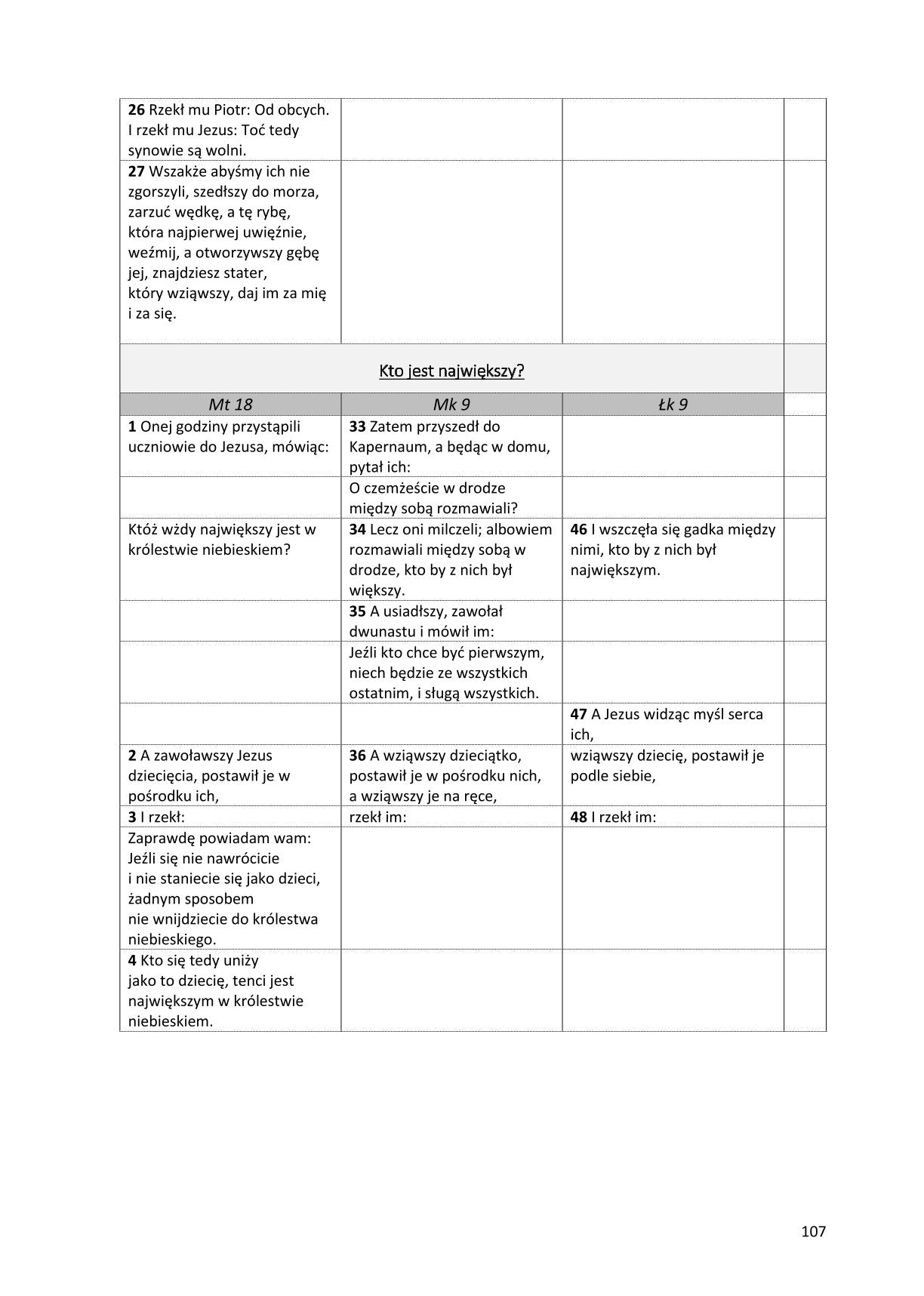 Wszystkie cztery Ewangelie są przejrzyście uporządkowane w formie tabeli, co pozwala na zachowanie przeglądu i skuteczne wyszukiwanie informacji.