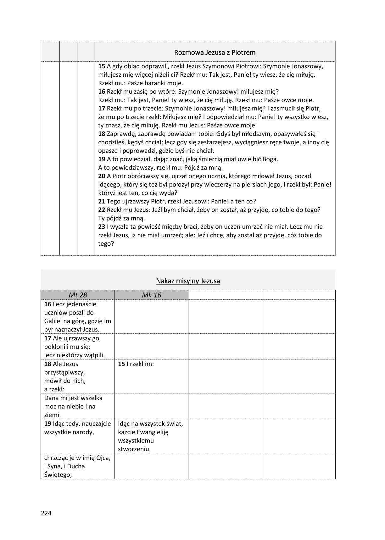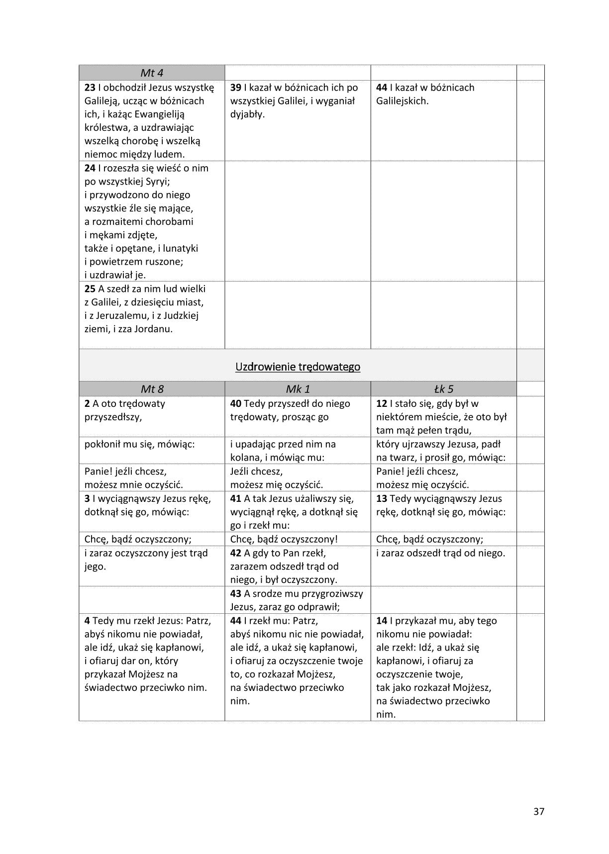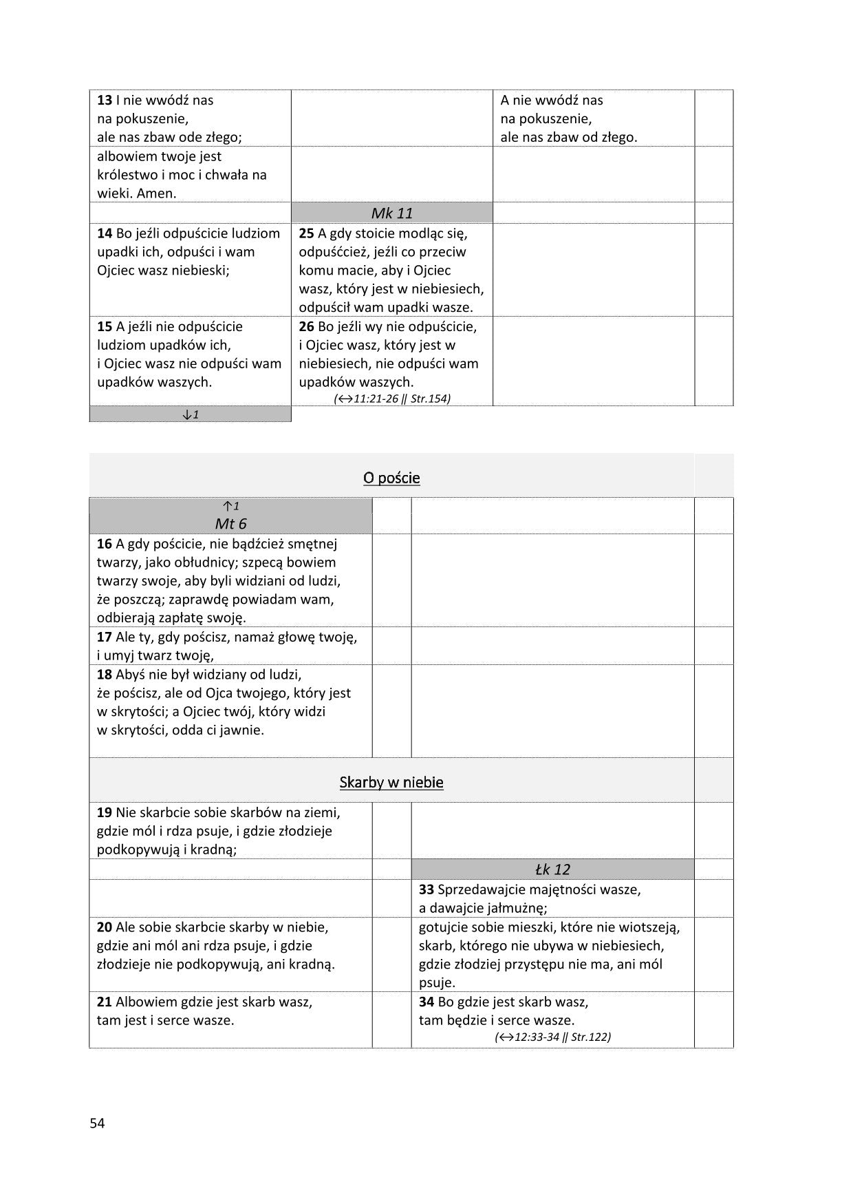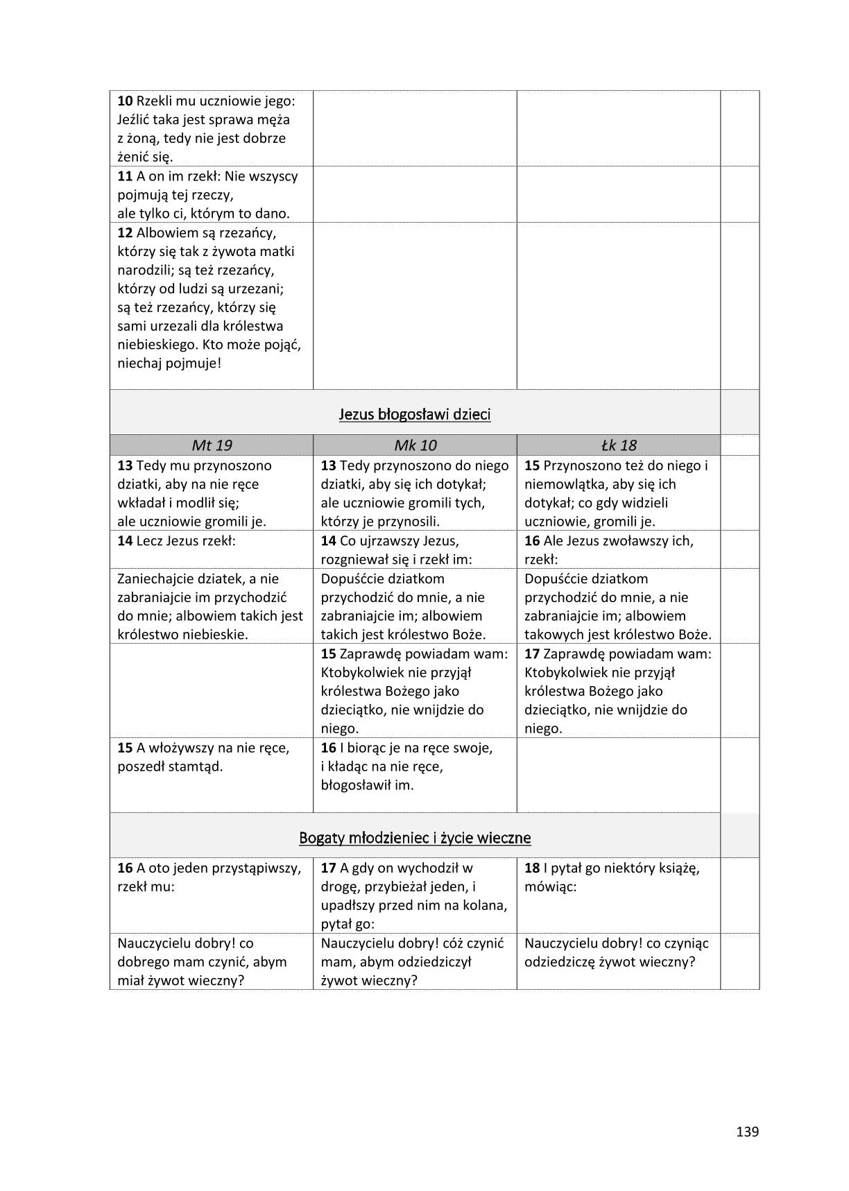 Wszystkie cztery Ewangelie są przejrzyście uporządkowane w formie tabeli, co pozwala na zachowanie przeglądu i skuteczne wyszukiwanie informacji.